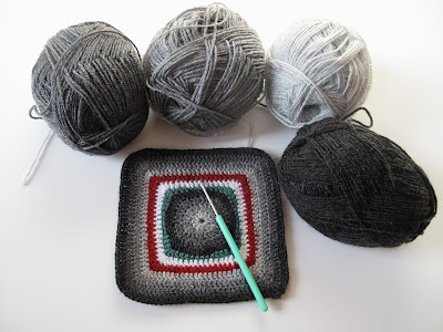 Decidi utilizar quatro tonalidades de cinza e esporadicamente um pouco de vermelho, branco ou verde (esmeralda?! turquesa?!); para o quadrado inaugural, fogo-de-artifício com todas as cores. Será feita ao sabor da imaginação,  uma irregular choice, haverá círculos e quadrados... e quanto ao resto, em fevereiro de 2017 saberei; também gosto de me surpreender a mim mesma.